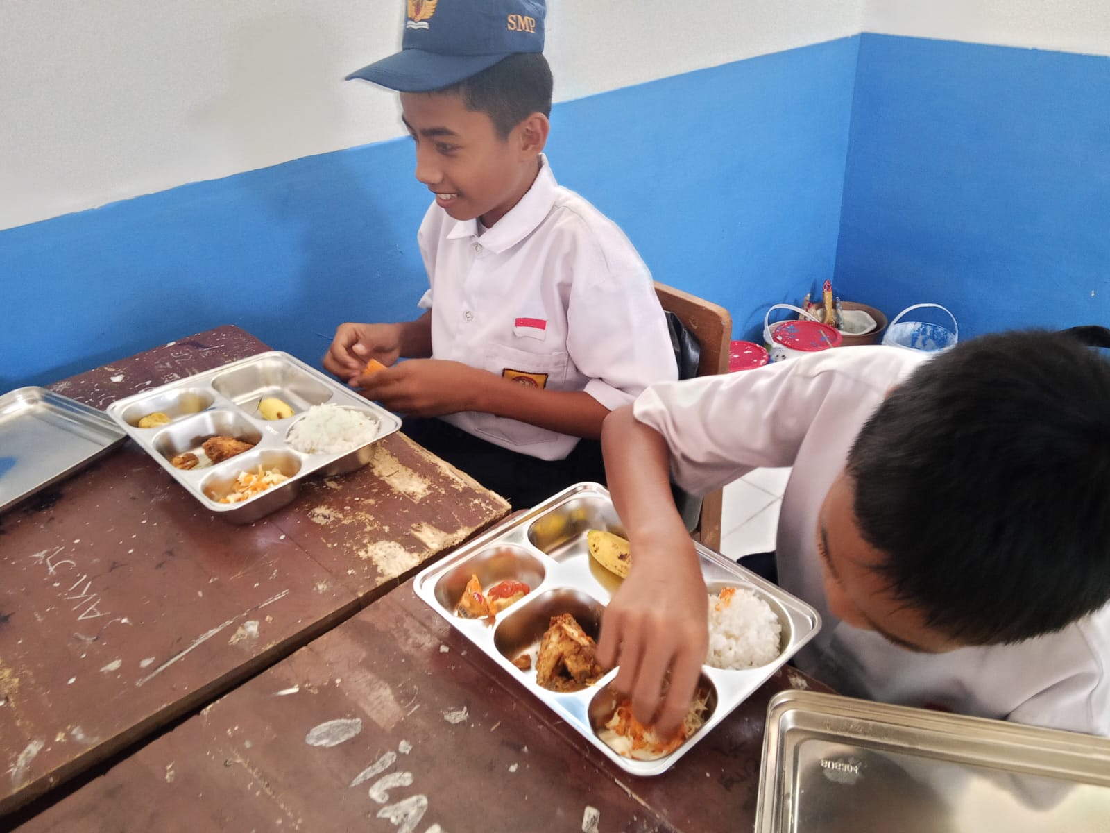 Salah satu program besar Presiden RI Prabowo Subianto yakni Makan Bergizi Gratis (MBG) akhirnya bisa dinikmati 233 siswa SMP Negeri 3 Kalukku. Pada Selasa 19 Agustus 2025 pukul 10.30, 233 porsi makanan diantarkan oleh tim MBG ke sekolah. Makanan yang dikemas dalam piring stainless tersebut langsung didistribusikan oleh para wali ke siswa yang menunggu di kelas masing-masing. Pembagian makanan gratis ini disambut hangat para siswa. Terlihat dari wajah-wajah mereka yang mengukir senyum saat menerima dan menyantap makanan. Adapun menu yang disajikan di antaranya, seporsi nasi putih, potongan ayam bumbu, tahu, sayur wortel dan kol, serta pisang. Meskipun sejumlah siswa mengaku kurang menyukai sajian wortel cincang yang dilumuri saus mayones, namun mereka memuji makanan yang diberikan terasa enak di lidah.